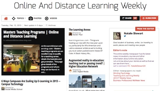 Online And Distance Learning Weekly, by Natalie Stewart: A free online newspaper with a curated selection of articles, blog posts, videos and photos about online and distance learning, for teachers and students.