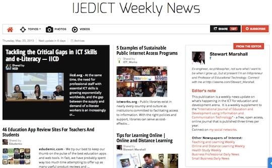 "IJEDICT Weekly News", by Stewart Marshall: a free, online newspaper with a curated selection of articles, blog posts, videos and photos about the use of ICT for education in developing and resource challenged contexts.